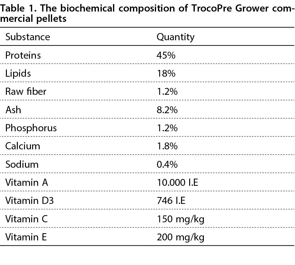 1. the fed control group (Fed C) was subjected to the classical feeding regime applied in aquaculture: juveniles were fed three times per day (at 9:00, 13:00 and 17:00 h) with Troco PreGrower commercial pellets (Table 1), the quantity of food given during a meal being equal to 1% of the total biomass; this regime was applied for the entire period of experiment;