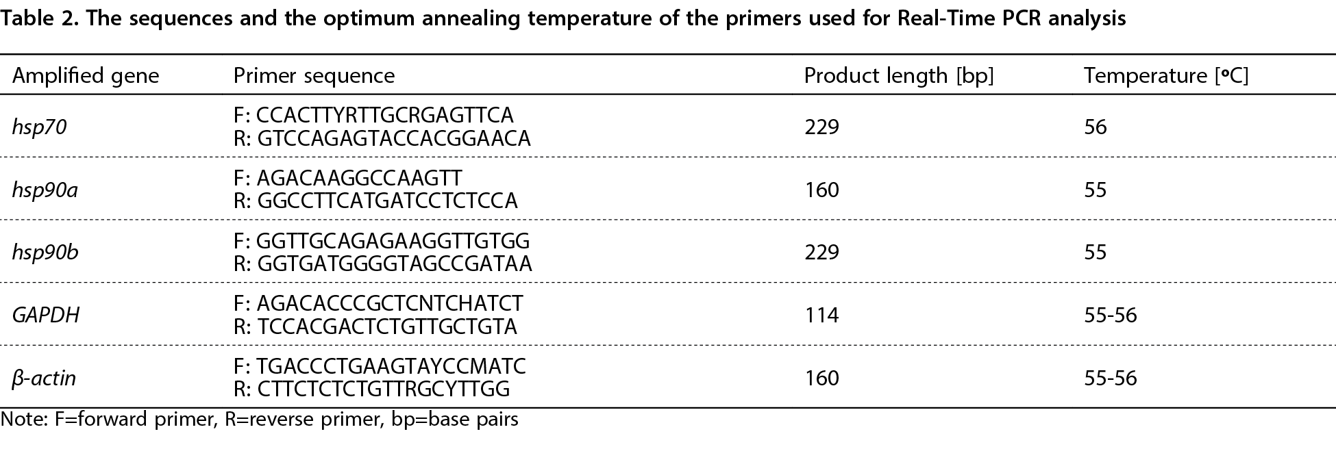 Real Time PCR. Primers were designed using the BLAST program (Altschul et al., 1990) in order to amplify hsp70, hsp90a and hsp90b genes and two reference genes encoding for glyceraldehyde 3-phosphate dehydrogenase (GAPDH) and β-actin in sturgeon species.