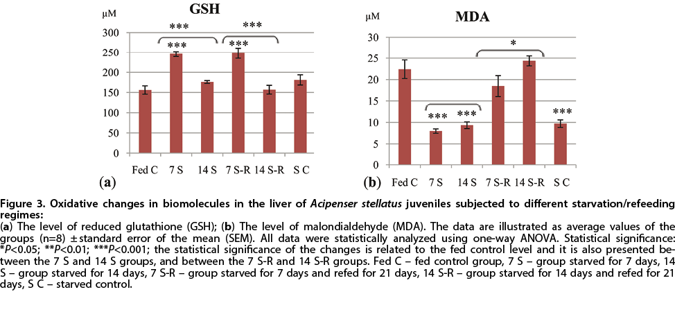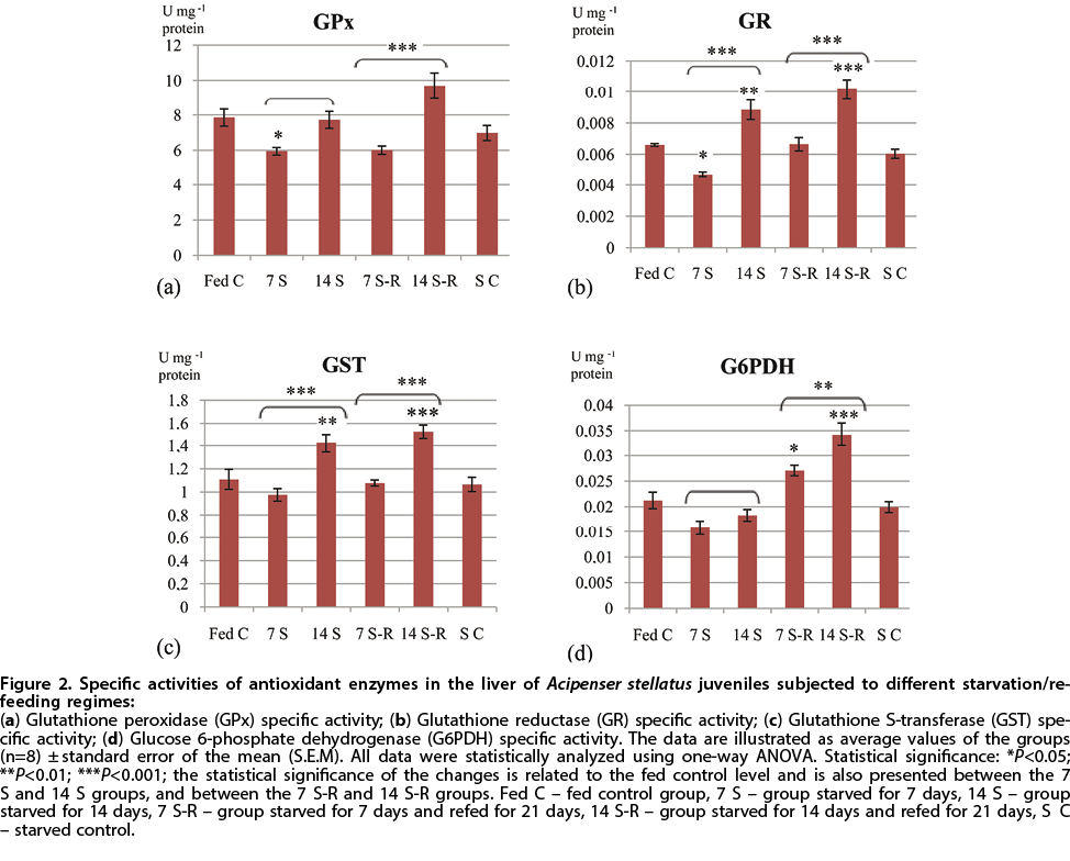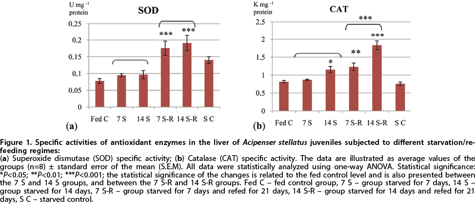 According to Guderley (Guderley, 2003), starvation determines a mobilization of energy reserves that affects the cellular components, rendering them prone to ROS. Therefore, the cells that could suffer oxidative damage enhance their antioxidant enzymatic system activities during starvation as a measure of prevention. Moreover, according to Trenzado (Trenzado, 2006), sturgeon liver synthesizes lipids in high amounts under physiological conditions, these being rich in PUFA that are prone to peroxidation. Therefore, it is stated that sturgeons possess a natural and effective antioxidant defense, increasing the level of antioxidants in order to prevent the peroxidation of fat deposits in the liver.