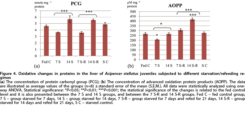 PCG and AOPP represent hallmarks of the oxidative stress and are irreversible changes in the proteins (Witko-Sarsat et al., 2003; Bansal & Kaushal, 2014). PCG consists of aldehydes and ketones that are produced during interaction between the hydroxyl ions and amino acids, such as lysine, arginine, proline and threonine (Requena et al., 2001). AOPP are considered to be cross-linked products of proteins that contain dityrosine (Witko-Sarsat et al., 2003). Also, they could be small products resulting from cleavage of a long polypeptidic chain due to protein oxidation mediated by the hypochlorous acid (Thomas, 1979; Thornalley & Rabbani, 2010) (S1). In our study, the concentration of PCG did not statistically differ in the juveniles from the experimental groups when compared to the Fed C group; however, the PCG concentration strongly increased in the 14 S group when compared to the 7 S group, and respectively in the 14 S-R group when compared to 7 S-R group (Fig. 4a). The AOPP level decreased after a 7-day starvation period, while it reached the control level when the juveniles were refed. In contrast, the AOPP level was similar to the control level after a 14-day starvation period, but it was strongly increased when refeeding was resumed. Also, like the PCG level, the AOPP level was also increased in the 14 S group when compared to the 7 S group, and respectively in the 14 S-R group when compared to the 7 S-R group (Fig. 4b).