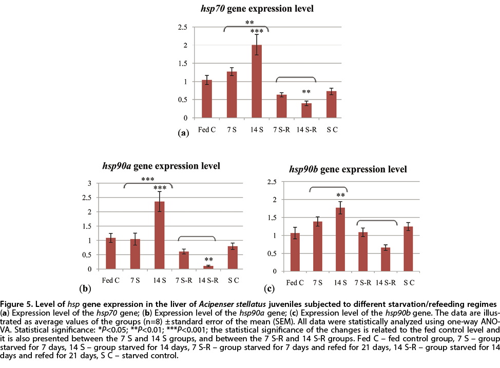 Molecular data showed that expression levels had similar profiles for hsp70, hsp90a and hsp90b genes. No significant changes were observed during a 7-day starvation period and also after subsequent refeeding when compared to the constant feeding regime. In contrast, gene expression increased during the 14-day starvation period and decreased during subsequent refeeding in the liver of A. stellatus juveniles when compared to the Fed C group. The expression of hsp70 and hsp90a genes was highly increased during 14-day starvation in comparison to 7-day starvation (Fig. 5).