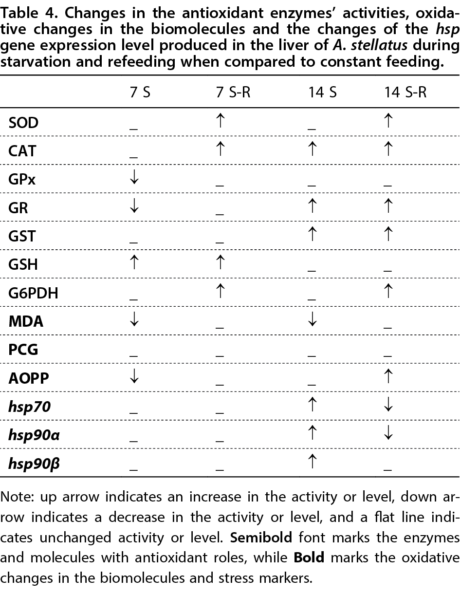 The 7-day starvation period induced no modification in SOD, CAT and GST activities and even reduced the GPx and GR activities when compared to constant feeding, suggesting that the 7-day starvation period did not induce oxidative stress in the liver of A. stellatus. Moreover, the 7-day starvation period decreased the level of lipid peroxidation and protein oxidation as reflected by lower MDA and AOPP levels when compared to the constant feeding regime. The GSH level increased during the 7-day starvation period, indicating an increase of the cellular antioxidant defense capacity.