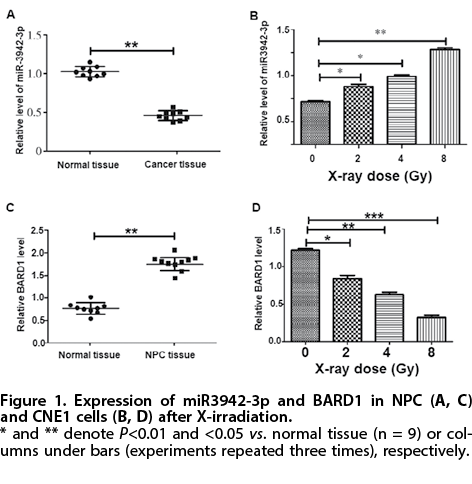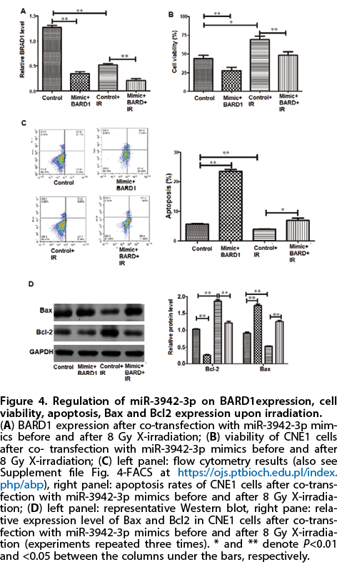 miR-3942-3p on radiosensitivity of NPC using NPC cell line CNE1. Cell viability, apoptosis and expression of apoptosis-related proteins Bax and Bcl2 were measured after exposing to X-rays and up- and down-regulation of miR-3942-3p using miR-3942-3p inhibitor and mimics. Our results showed up-regulation of miR-3942-3p sensitizes CNE1 cells to X-radiation and this sensitization is likely mediated by BARD1, which is a targeted by miR-3942-3p. These findings could be further explored to improve radiotherapy strategies for NPC.