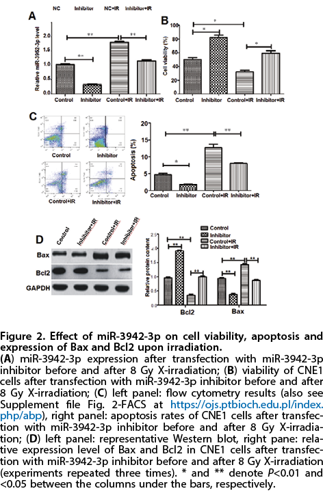In the study, in addition to cell viability and apoptosis assays, the expression of Bax and Bcl2 was assessed to further deliberate the cellular response at molecular levels. The Bcl2 family proteins are key regulators of apoptosis cell death and Bcl2 is a pro-survival protein that suppresses cell death (Adams & Cory, 1998; Leibowitz & Yu, 2010) and Bax is an pro-apoptotic protein that promotes cell death (Youle & Strasser, 2008). During apoptosis, Bax is often up-regulated and Bcl2 is down-regulated in cancer cells (Naseri et al., 2015). It has been shown that a high ratio of Bax to Bcl2 can lead to collapse the potential of mitochondrial membrane, leading to the release of cytochrome c and consequently apoptosis (Boersma et al., 1997; Teijido & Dejean, 2010). Previously, radiation was shown to increase the Bcl-xl to Bax protein ratios in human cell sensitive to UVC-radiation (Kita et al., 2011) and UV-irradiation increased the expression of Bax and increased Bcl2 expression and apoptotic rates (Jia et al., 2012). Similarly, in our study, increased apoptosis was observed to associate with increased Bax expression and reduced Bcl2 expressions, suggesting that Bcl2 family proteins are involved in miR-3942-3p and radiation-related apoptosis.