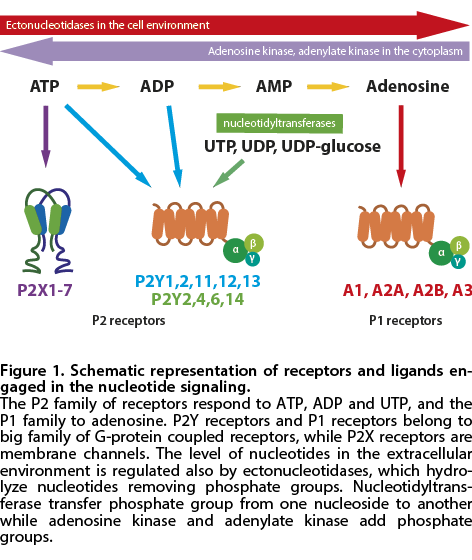 The first report that ATP, apart from its energetic function, can act as a neurotransmitter appeared in 1972 (Burnstock, 1972). Burnstock in his research indicated that the intestines and bladder of a guinea pig subjected to the action of extracellular ATP would contract independently of known neurotransmitters. Initially, the scientific world was skeptical about the idea of nucleotide signaling. This opinion was widespread because of earlier research that focused mainly on the intracellular processes related to the energetic functions of ATP (Gillespie, 1934; Lipmann, 1941; Meyerhof, 1951; Lo et al., 1968). The reluctance of the community was also caused by the results of ATP concentration measurements in the extracellular environment (1–10 nM outside the cell, 3-5 mM in the cytoplasm), and the size and charge of the molecule, which does not allow it to freely penetrate the cell membrane (Chaudry, 1982). In 1976, Burnstock, relying on pharmacological research, defined proteins that participated in the cell’s response to extracellular ATP calling them purinergic receptors. In the course of further pharmacological and molecular studies, he divided nucleotide receptors into two groups. Since the signaling role of adenosine was known for half of the century already (Drury & Szent-Györgyi, 1929), the first group was P1 receptors, stimulated by adenosine, and a new group, P2, was created for receptors stimulated by ATP and ADP. Further studies at Burnstock’s laboratory led to the division of the P2 family into metabotropic receptors or receptors that evoke a cascade of intracellular reactions as an effect of binding the ligand (Encyclopedia of Pain, 2013) – P2Y – and ionotropic receptors, opening membrane channels after binding the ligand (North, 2016) – P2X (Burnstock & Kennedy, 1985; Burnstock & Verkhratsky, 2012) (Fig. 1). Moreover, studies on the conversion of nucleotides after their release into the extracellular environment have resulted in the discovery of enzymes that hydrolyze nucleotides on the surface of the cell membrane. This created a more comprehensive picture of nucleotide signaling (Ziganshin et al., 1994; Lazarowski et al., 2000).