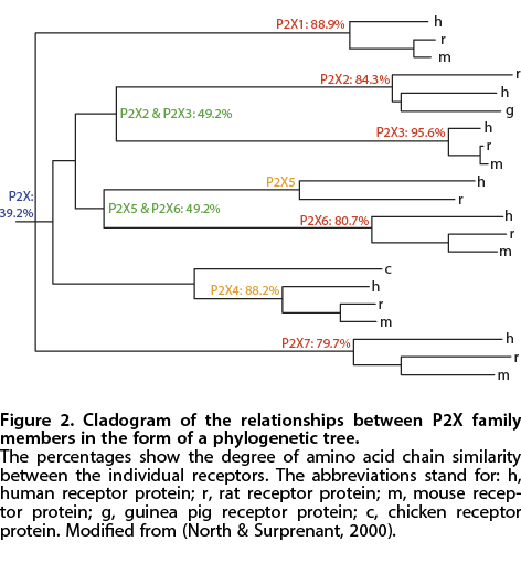Receptors from the P2X family are completely unrelated to P2Y receptors. P2X receptors are non-selective cation channels that open upon stimulation with ATP or its synthetic analogs (North, 2016), causing ion current flow and depolarization of the cell membrane. Such receptors are called ionotropic receptors. The ionotropic receptors are not monomers – for the receptor to function properly, a multi-molecular, oligomeric protein complex must be formed, which creates an ion channel in the cell membrane. These receptors can form both homo- and heterooligomers. A functional P2X receptor usually consists of three subunits from which the ion channel is created (Ralevic & Burnstock, 1998). The P2X receptor subunit consists of two transmembrane regions (TM1 and TM2), intracellular C- and N-terminals, and an extracellular loop that can undergo many post-transplantation modifications. The TM1 transmembrane domain is involved in the regulation of the conduction of channels, while the TM2 domain plays a key role in ion channel formation (Khakh et al., 2001). In the extracellular loop, there are localized binding sites for ATP and allosteric regulators (Garcia-Guzman et al., 1997; Clarke et al., 2000; Jiang et al., 2000a; Ennion et al., 2000). So far, seven genes encoding subunits of the P2X family of receptors have been discovered, numbered 1 to 7 (North, 2002). The similarity between the proteins in this family ranges from 30 to 50 percent depending on the receptor (Fig. 2). P2X family receptors are widely distributed in mammalian cell lines and tissues (Burnstock & Knight, 2004; Burnstock, 2007).
