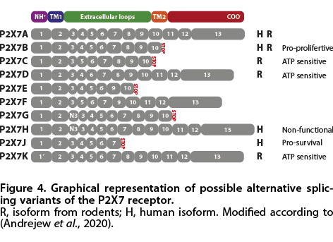 In rodents, four splice variants were also detected for the gene encoding the P2X7 subunit (P2X7B, P2X7C, P2X7D, P2X7K) along with the canonical P2X7A isoform composed of 595 amino acids. The P2X7B and P2X7D isoforms can form heterodimers with the P2X7A isoform, reducing the activity of the P2X7 receptor constructed in this way. The P2X7K isoform, composed of 592 amino acids, after the creation of the P2X7 receptor has a greater affinity for ATP than the receptor composed of subunits of the P2X7A isoform (Schwarz et al., 2012).