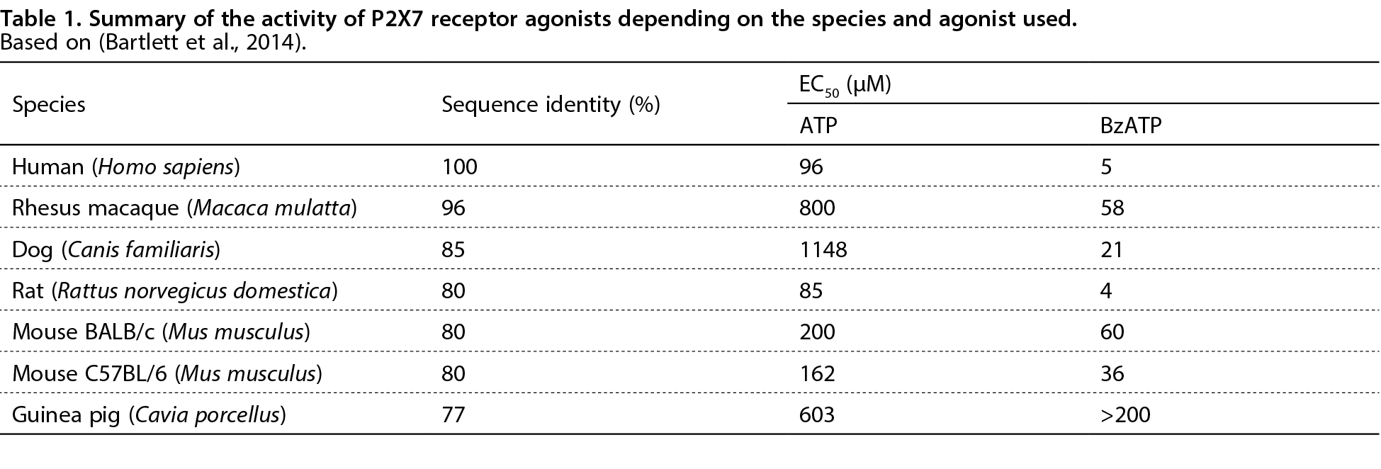 The P2X7 receptor, like all receptors in this group, is activated upon stimulation with extracellular ATP. However, compared to other P2X receptors, the ligand concentration needs to be higher, from 50 µM to 2.5 mM. The concentration that effectively activates the receptor varies from species to species (Surprenant et al., 1996; Rassendren et al., 1997; Fonfria et al., 2008; Roman et al., 2009; Bradley et al., 2011).