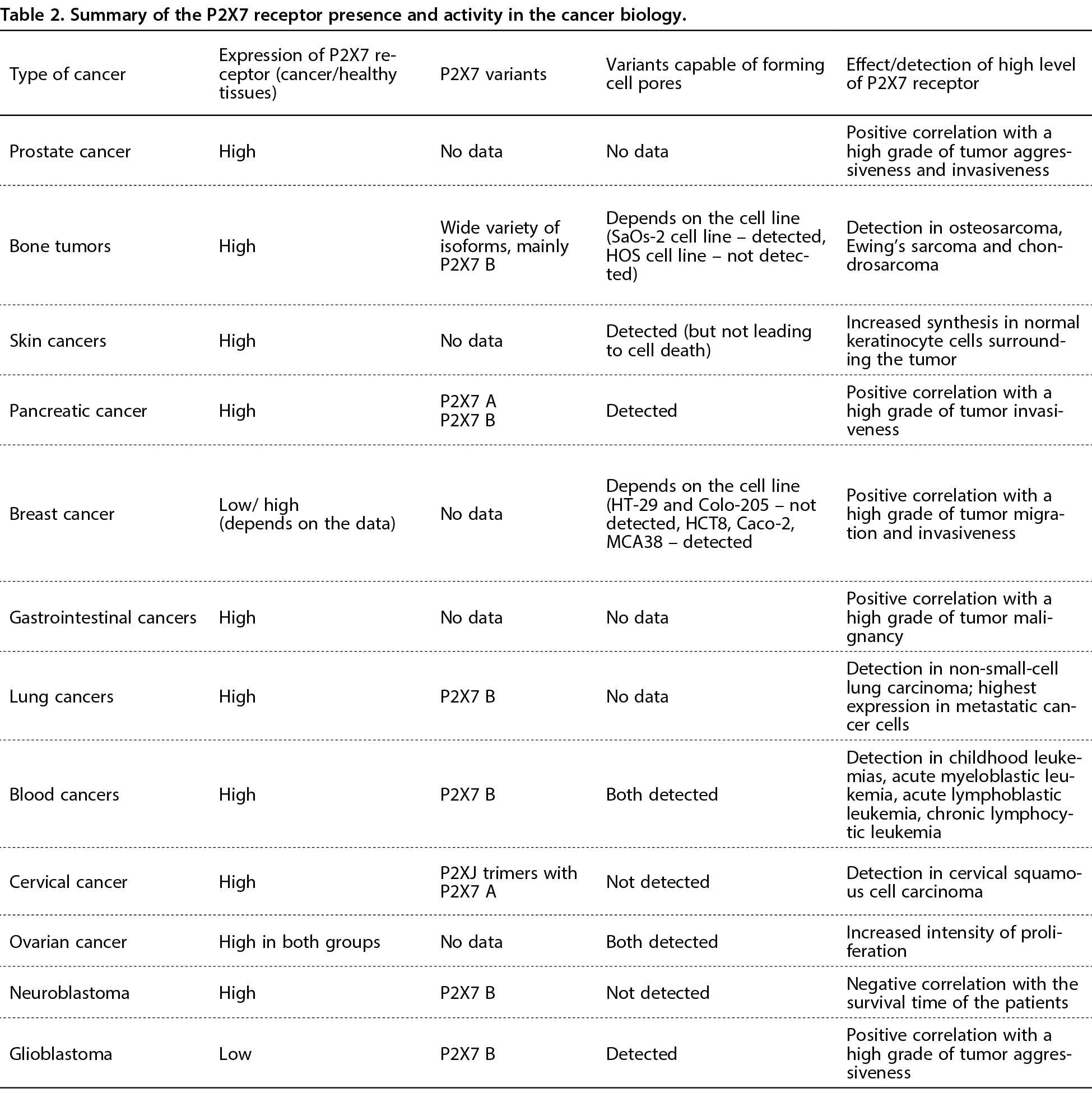 The P2X7 receptor is as common in cancer cells as it is in somatic cells. Stress-related to intra-tumor hypoxia and cancer cell death as a result of chemotherapy or radiotherapy (Martins et al., 2009; Lecciso et al., 2017) may increase the release of ATP into the environment. In addition, the presence of tumor-specific proteins such as SLC29A1, SLC29A2, and SLC28A1-A3 nucleoside transporters may significantly affect the increased concentration of ATP in the tumor environment (Gray et al., 2004; Young et al., 2013). The observed effect of the increased concentration of extracellular nucleotides on cancer depends, however, on the type of tissue from which the tumor originates. Therefore, it should be described in some detail how different the P2X7 receptor response may be depending on the cancer type. The chapter is summarized in Table 2.